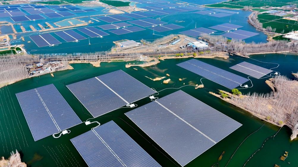 ?這是山東省濟(jì)寧市微山縣驩城鎮(zhèn)利用采煤塌陷區(qū)約3600畝水面建設(shè)的漁光互補(bǔ)項(xiàng)目(2024年3月20日攝,無(wú)人機(jī)照片)。該項(xiàng)目集光伏發(fā)電、漁業(yè)養(yǎng)殖、生態(tài)修復(fù)于一體。新華社記者郭緒雷攝