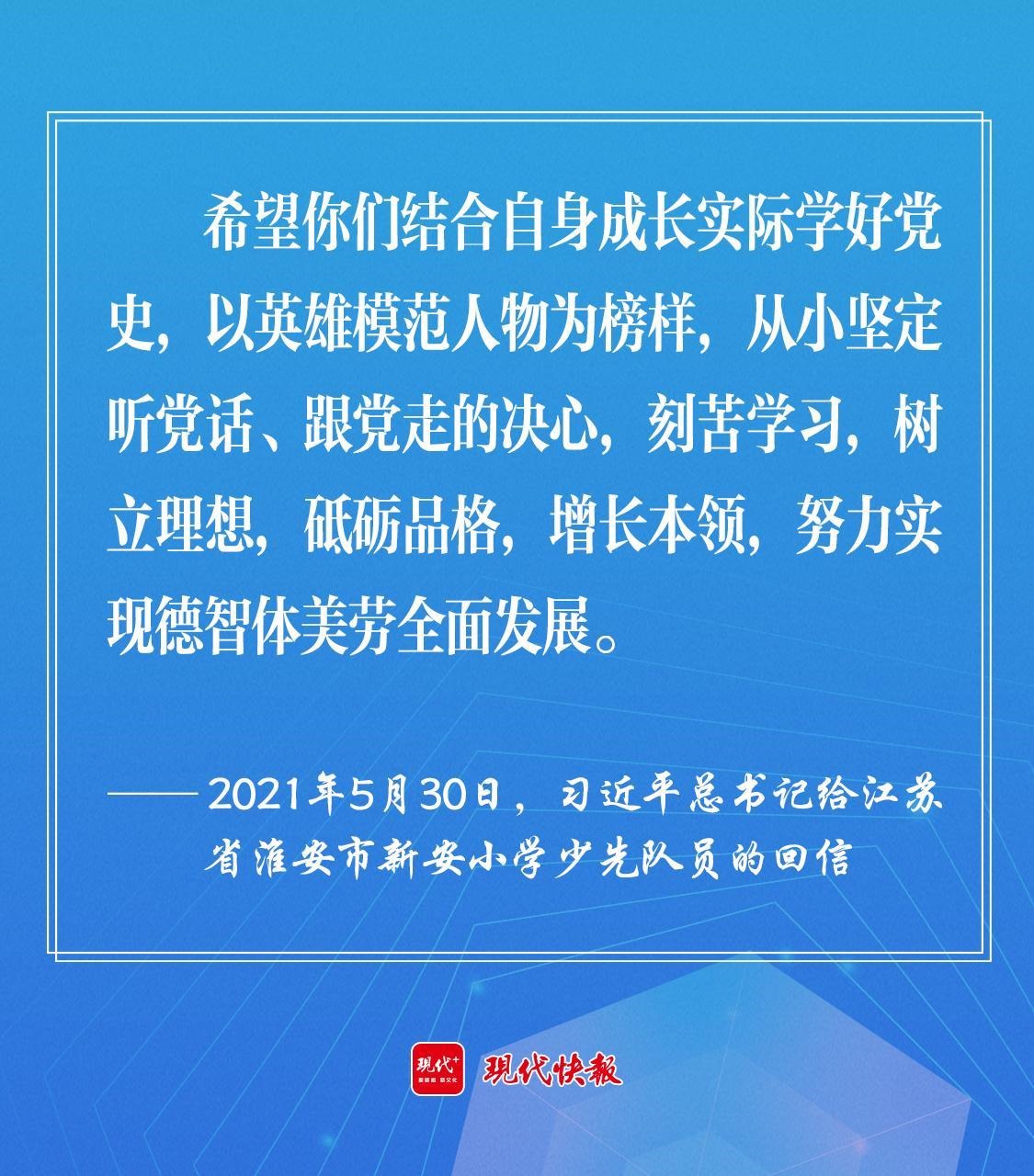 2021年5月30日,習(xí)近平總書記給江蘇省淮安市新安小學(xué)少先隊員回信時強(qiáng)調(diào),“希望你們結(jié)合自身成長實際學(xué)好黨史,以英雄模范人物為榜樣,從小堅定聽黨話、跟黨走的決心,刻苦學(xué)習(xí),樹立理想,砥礪品格,增長本領(lǐng),努力實現(xiàn)德智體美勞全面發(fā)展。”