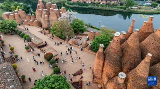 人們在云南省紅河州彌勒市東風(fēng)韻小鎮(zhèn)游玩(無人機照片,4月5日攝)。