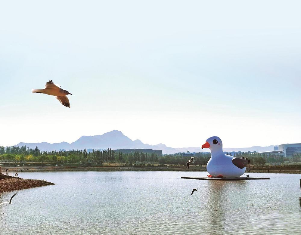 站在烏海湖畔旁,看著一片陽光灑在波光粼粼的水面上,泛著細碎的金光。在這充滿詩意的秋色里,主角“紅嘴鷗”天團準時赴約。它們穿著“白衣紅鞋”,時而在波光粼粼的湖面上輕盈滑翔,時而一個猛子扎下去,精準捕獲水中的美味。