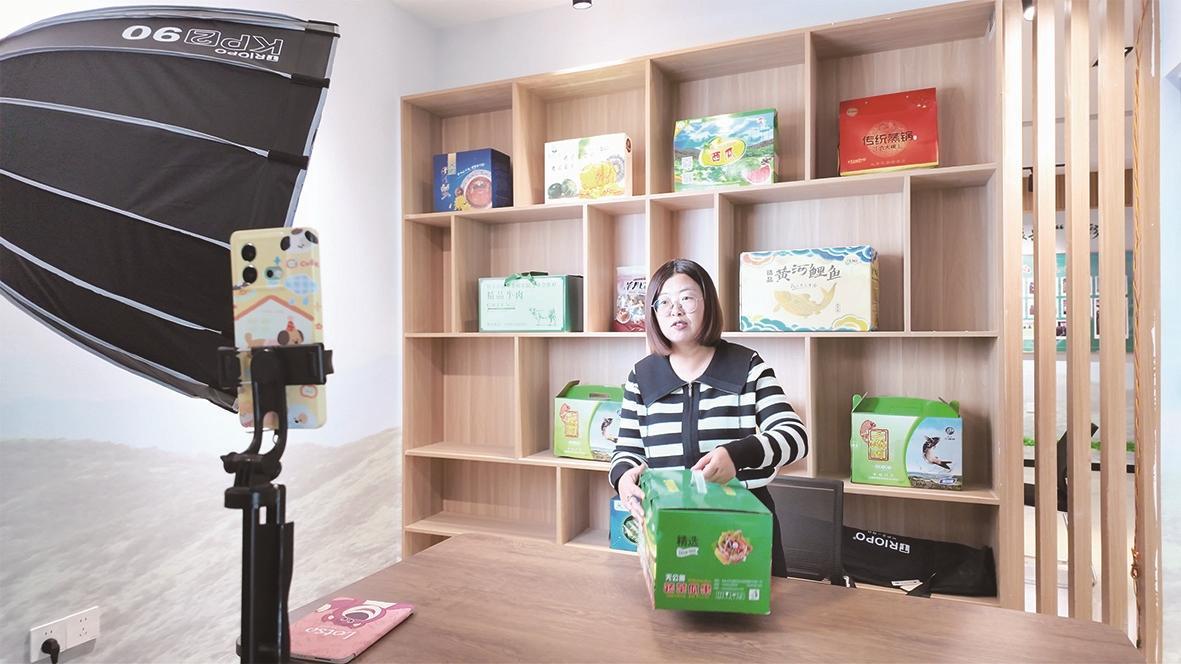 返鄉(xiāng)創(chuàng)業(yè)的“95后”青年王亞春在直播間帶貨助農(nóng)。