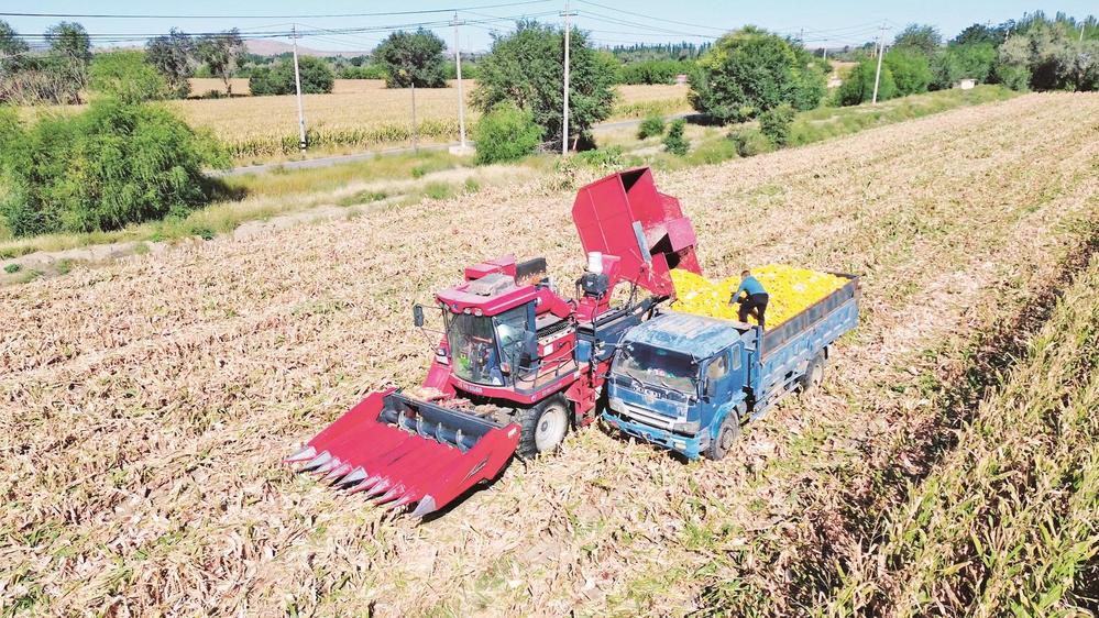 在烏達區(qū)烏蘭淖爾鎮(zhèn),農機手駕駛收割機在農田里收割玉米。