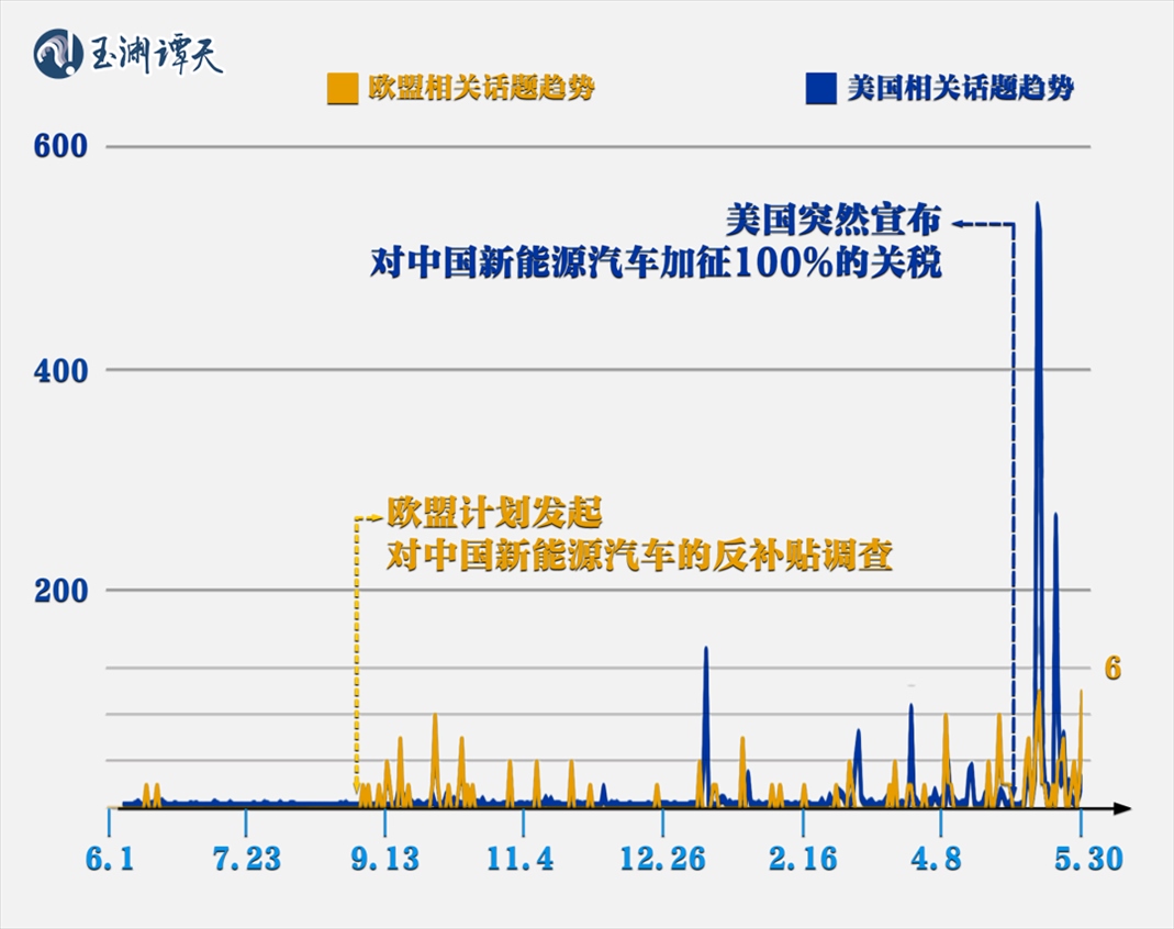 譚主分地區(qū)集納了過去一年外媒關(guān)于“對中國新能源汽車加征關(guān)稅”的報道,發(fā)現(xiàn)美國和歐洲地區(qū)出現(xiàn)了明顯的錯峰: