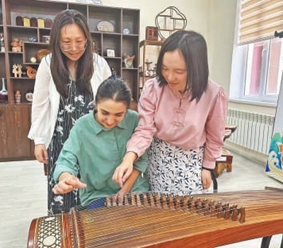 聯(lián)合采訪團隊塔方記者在孔子學院體驗古箏。本報記者 顏 歡攝