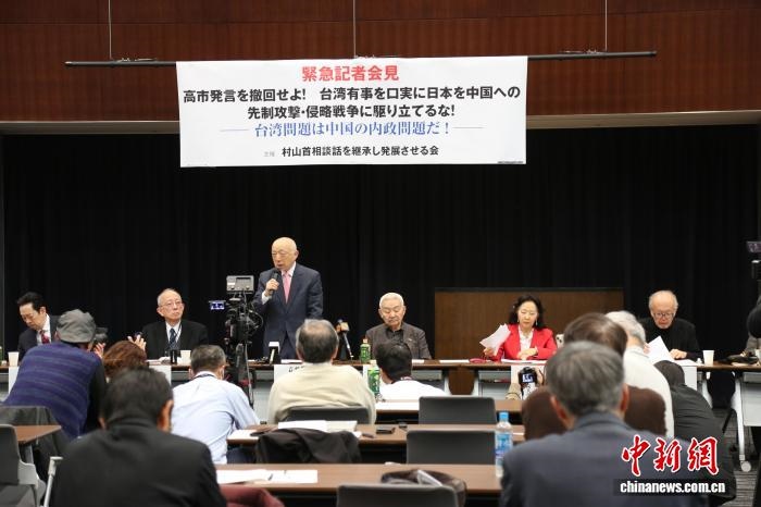 12月8日,日本多名學(xué)者及市民團(tuán)體代表在位于東京的日本參議院議員會館舉行記者會,要求日本首相高市早苗撤回涉臺錯(cuò)誤言論。圖為“繼承和發(fā)展村山談話會”理事長藤田高景發(fā)言。中新社記者 朱晨曦 攝