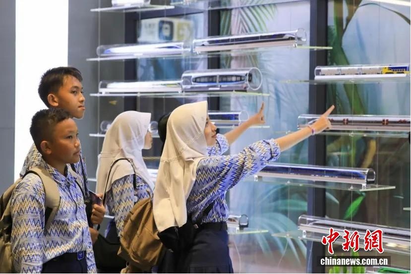 當(dāng)?shù)貢r間2024年10月17日,一群印尼學(xué)生在印尼雅加達(dá)的雅萬高鐵動車組科普文化交流基地參觀。 中新社記者 李志全 攝