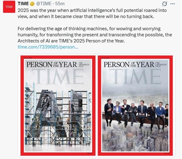 《時(shí)代》周刊在社交媒體上稱,2025年是人工智能潛力全面爆發(fā)且無(wú)可回頭的一年。