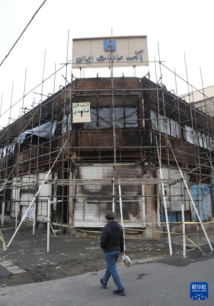 1月21日,在伊朗首都德黑蘭,一名男子走過在近期騷亂事件中受損的銀行。新華社記者 沙達提 攝