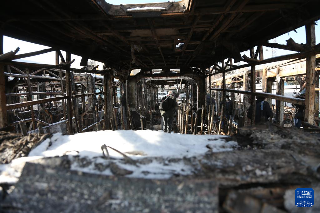 1月21日,在伊朗首都德黑蘭,一名男子走過在近期騷亂中被燒毀的公交車。新華社記者 沙達提 攝