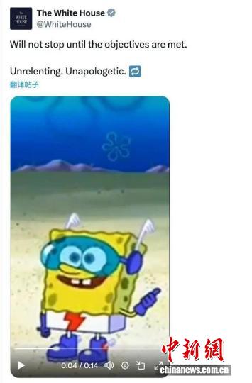 這是美國白宮社交媒體賬號截圖。該賬號發(fā)布的這段視頻中,海綿寶寶、電子游戲的歡快旋律與空襲伊朗的火光被剪輯在一起,視頻配發(fā)文字“不達目的不罷休”。