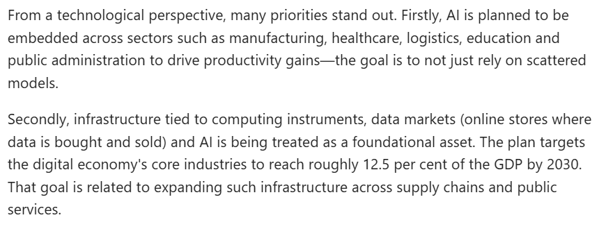 文章認為,首先,人工智能被規(guī)劃融入制造業(yè)、醫(yī)療、物流、教育及公共管理等領域,以提升生產(chǎn)力,其目標是不再局限于零散的應用模式。其次,與計算設備、數(shù)據(jù)市場及人工智能相關的基礎設施,正被視作一種基礎性資產(chǎn)。規(guī)劃綱要提出,“十五五”時期數(shù)字經(jīng)濟核心產(chǎn)業(yè)增加值占國內生產(chǎn)總值比重達到12.5%。這一目標與在供應鏈及公共服務領域擴展此類基礎設施密切相關。