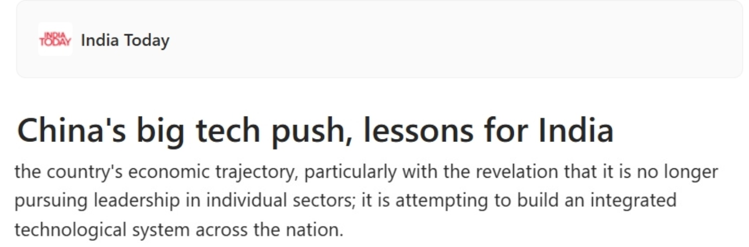 《今日印度》網(wǎng)站近日刊文稱,中國近期通過的“十五五”規(guī)劃綱要為下階段發(fā)展指明了方向。其中引人注目的是,規(guī)劃綱要不再追求在單一領域取得領先地位,而是試圖構建全國一體化的技術體系。