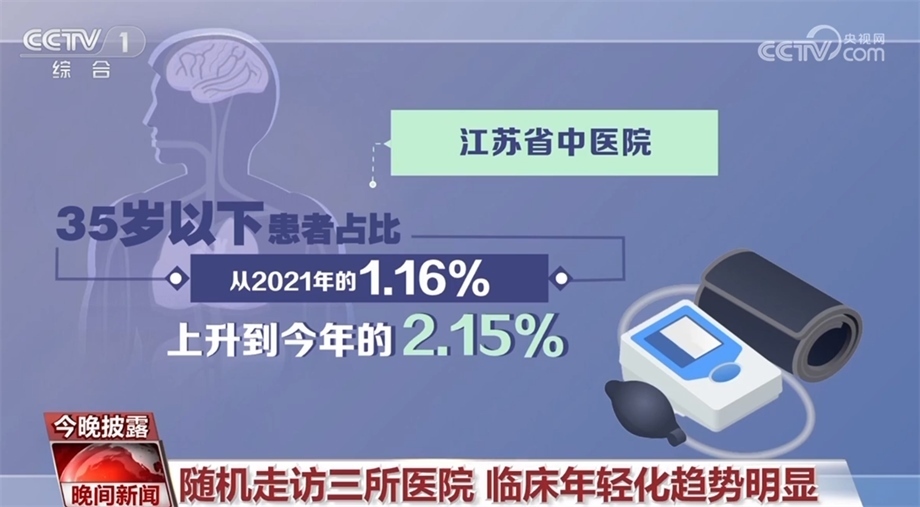 總臺(tái)記者隨機(jī)走訪了北京、江蘇、河南三所醫(yī)院的高血壓門(mén)診發(fā)現(xiàn):河南省洛陽(yáng)市第一人民醫(yī)院,2022年接診的3000多名患者中,低于30歲的有21人;江蘇省中醫(yī)院,35歲以下患者占比從2021年的1.16%,上升到今年的2.15%;北京安貞醫(yī)院的數(shù)據(jù)則顯示,70%的門(mén)診患者為中青年群體。