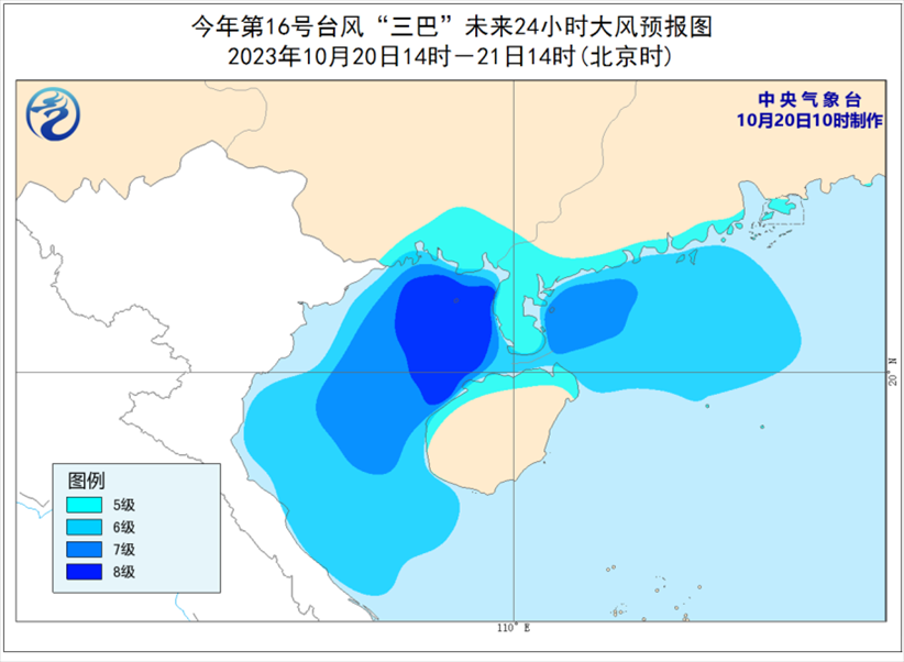 大風預報:20日14時至21日14時,南海西北部、北部灣、瓊州海峽、廣東中西部沿海、廣西沿海、海南島北部和西部沿海將有6-8級風,陣風9-10級。