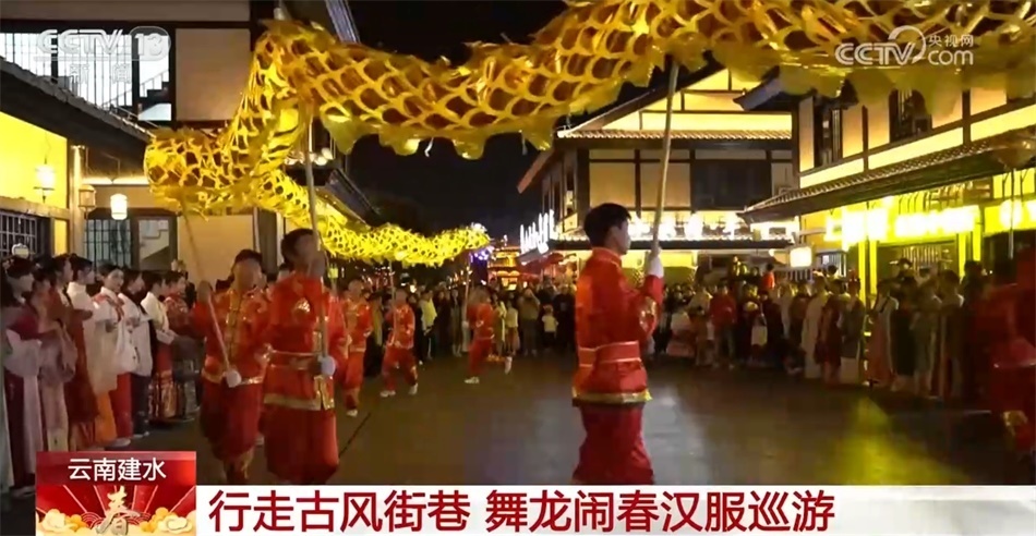 在云南紅河州建水縣紫陶里漢唐街區(qū),一場舞龍鬧春漢服巡游活動拉開了序幕。舞龍隊伍一路閃轉騰挪,一條黃色長龍奮力舞動,忽高忽低,飄忽飛逸。身著華美漢服的姑娘行走在古風街巷間,一種古樸幽遠的韻味撲面而來。市民與游客在感受建水年味的同時,也體驗到中華傳統(tǒng)文化之美。