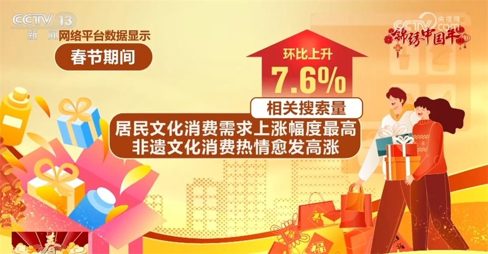網(wǎng)絡(luò)平臺數(shù)據(jù)顯示,春節(jié)期間,居民文化消費(fèi)需求上漲幅度最高,非遺文化消費(fèi)熱情愈發(fā)高漲,相關(guān)搜索量環(huán)比上升7.6%。其中,非遺廟會、燈會最受游客歡迎。