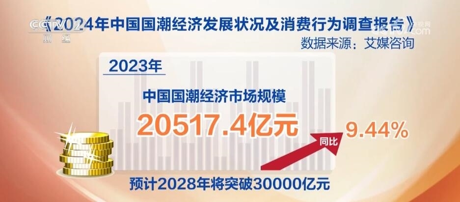 據(jù)調(diào)查,2023年中國“國潮”經(jīng)濟市場規(guī)模為20517.4億元,同比增長9.44%,預計2028年將突破30000億元。