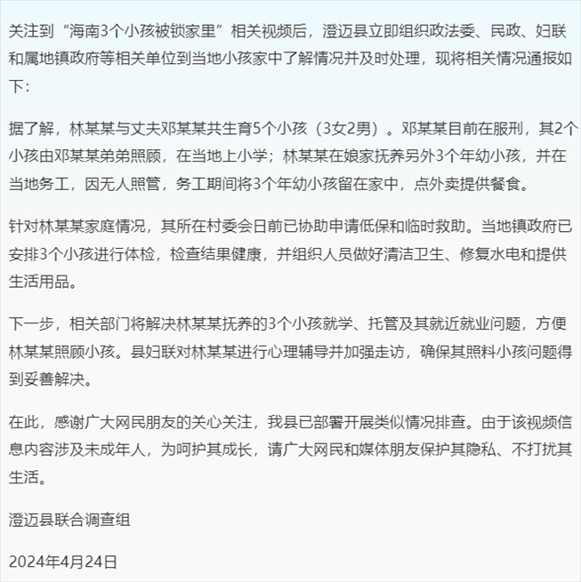 ·官方通報(bào)“海南3個(gè)小孩被鎖家里”:村委會(huì)已協(xié)助申請低保和臨時(shí)救助。