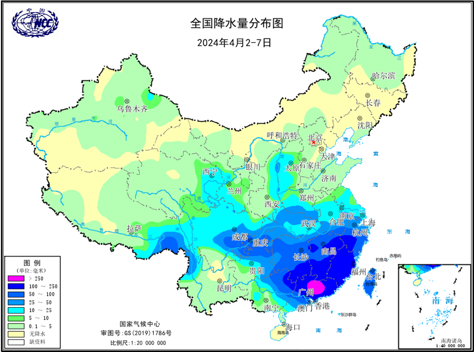 14次區(qū)域暴雨過程襲擊我國(guó),較常年同期明顯偏多。春季,我國(guó)共發(fā)生14次區(qū)域暴雨過程,較常年同期偏多3.8次。4月2-7日的暴雨過程為1961年以來(lái)同期第八強(qiáng),受其影響,我國(guó)華東南部、華中南部、華南東部及貴州東北部、重慶、四川中東部等地累計(jì)降水量50~100毫米,浙江西南部、福建、江西南部、湖南東南部、廣東大部等地累計(jì)降水量100~250毫米,局地超過250毫米(圖5);湖南茶陵(203.2毫米)、廣東始興(145.3毫米)日降水量超過極端閾值。