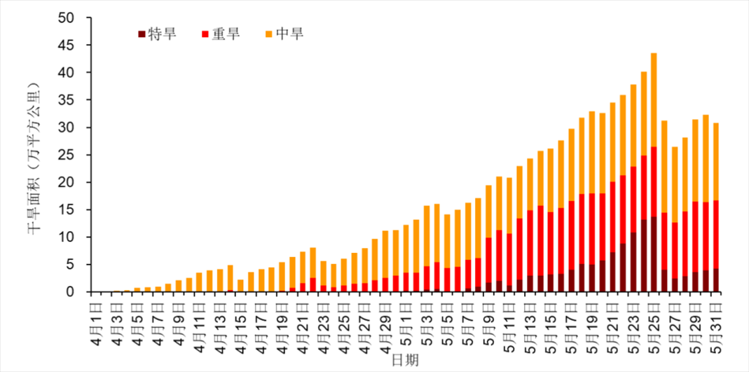 西南地區(qū)冬春連旱緩解,黃淮江淮干旱露頭發(fā)展。今年以來(lái)由于溫高雨少,我國(guó)西南地區(qū)出現(xiàn)冬春連旱,4月17日重旱及以上面積(32.6萬(wàn)平方公里)、特旱面積(13萬(wàn)平方公里)達(dá)到峰值。進(jìn)入5月后出現(xiàn)多次降水過程,冬春連旱緩解。4月以來(lái),黃淮、江淮等地氣象干旱開始露頭并發(fā)展。至5月25日,中旱及以上等級(jí)干旱面積(43.6萬(wàn)平方公里)和特旱面積(13.7萬(wàn)平方公里)均達(dá)最大(圖6)。目前,黃淮中部、江淮北部、江漢東部等地仍存在中度及以上等級(jí)氣象干旱。5月31日,魯豫皖蘇鄂五省中旱以上干旱面積30.8萬(wàn)平方公里,其中重旱12.4萬(wàn)平方公里,特旱4.3萬(wàn)平方公里(圖7)。