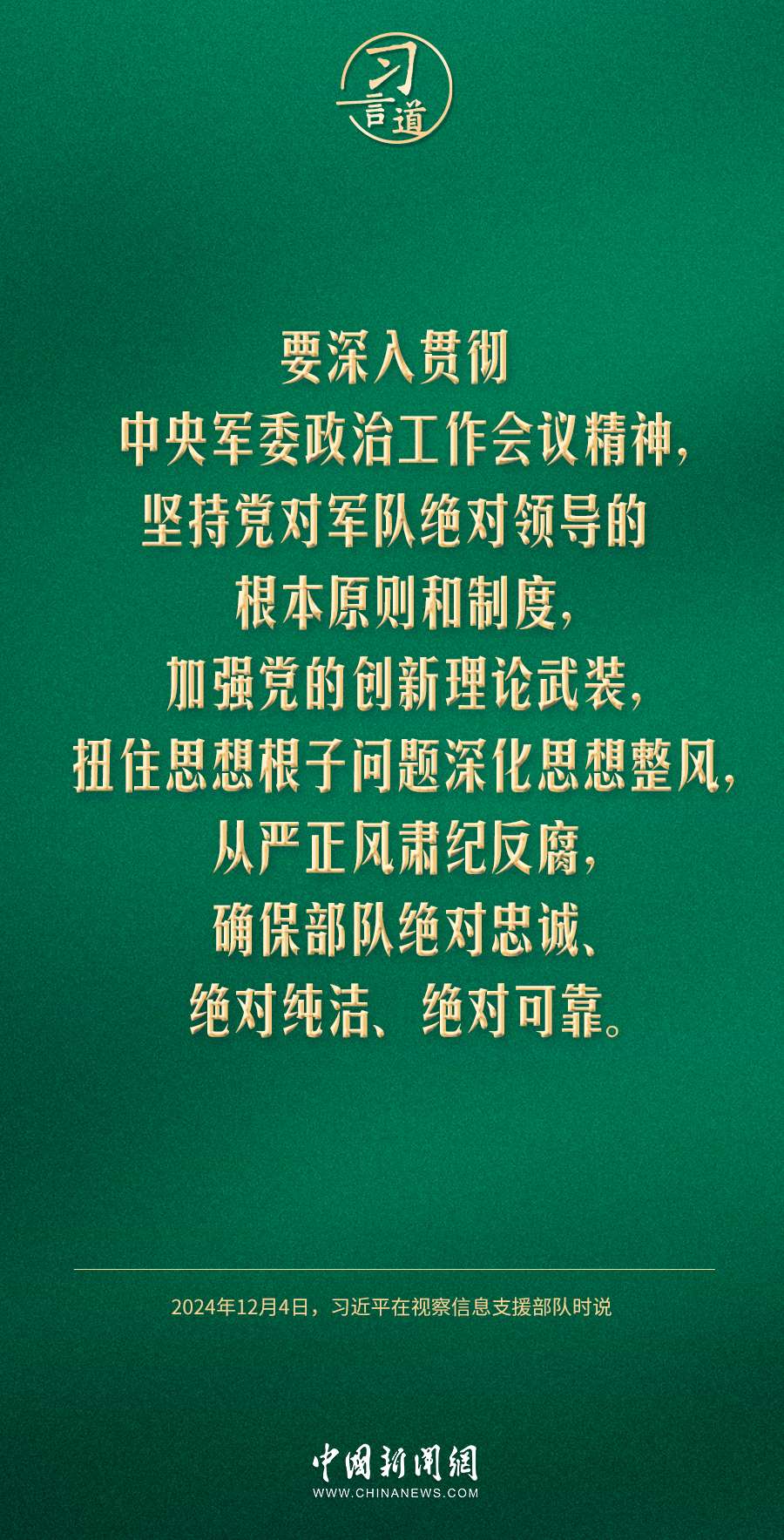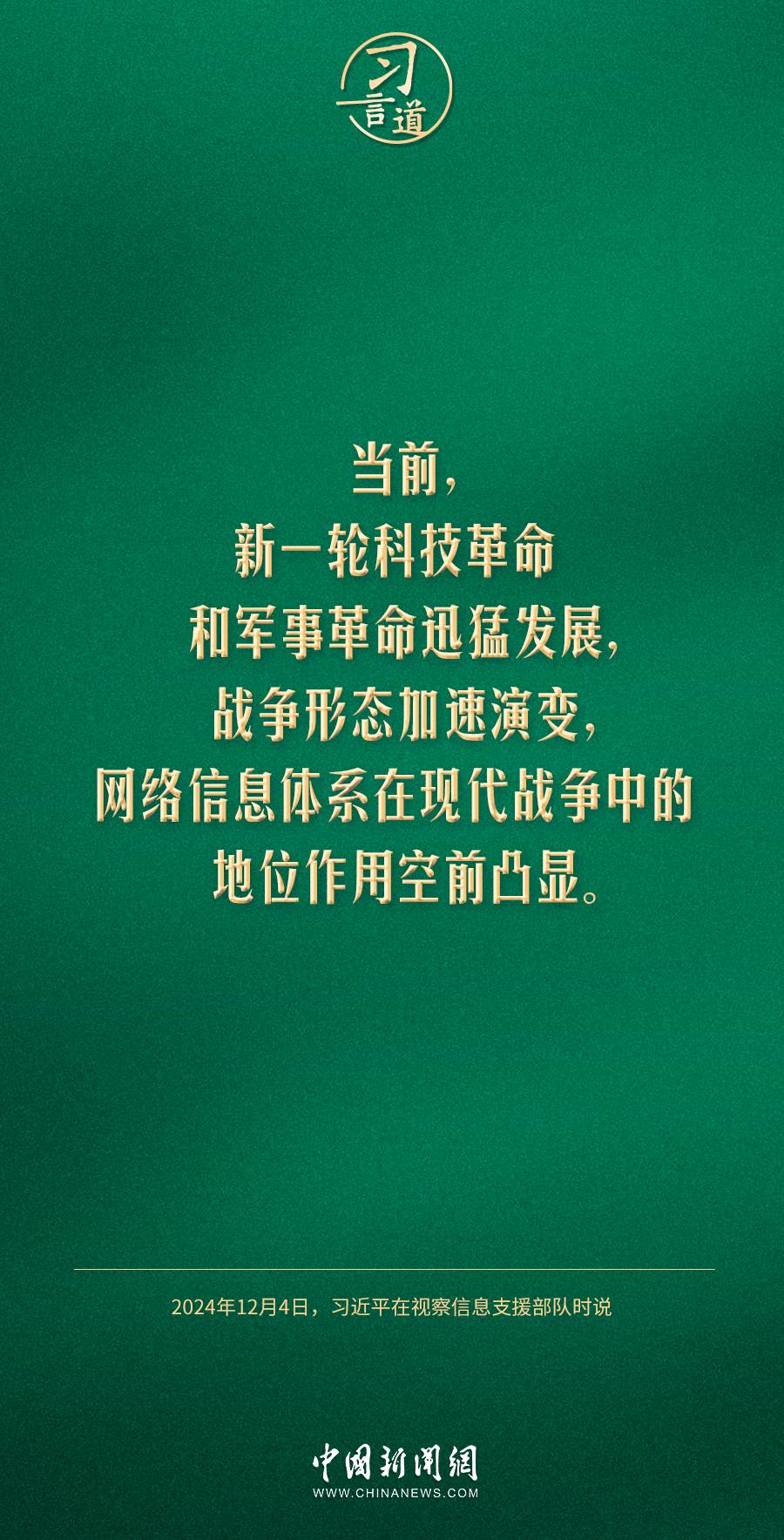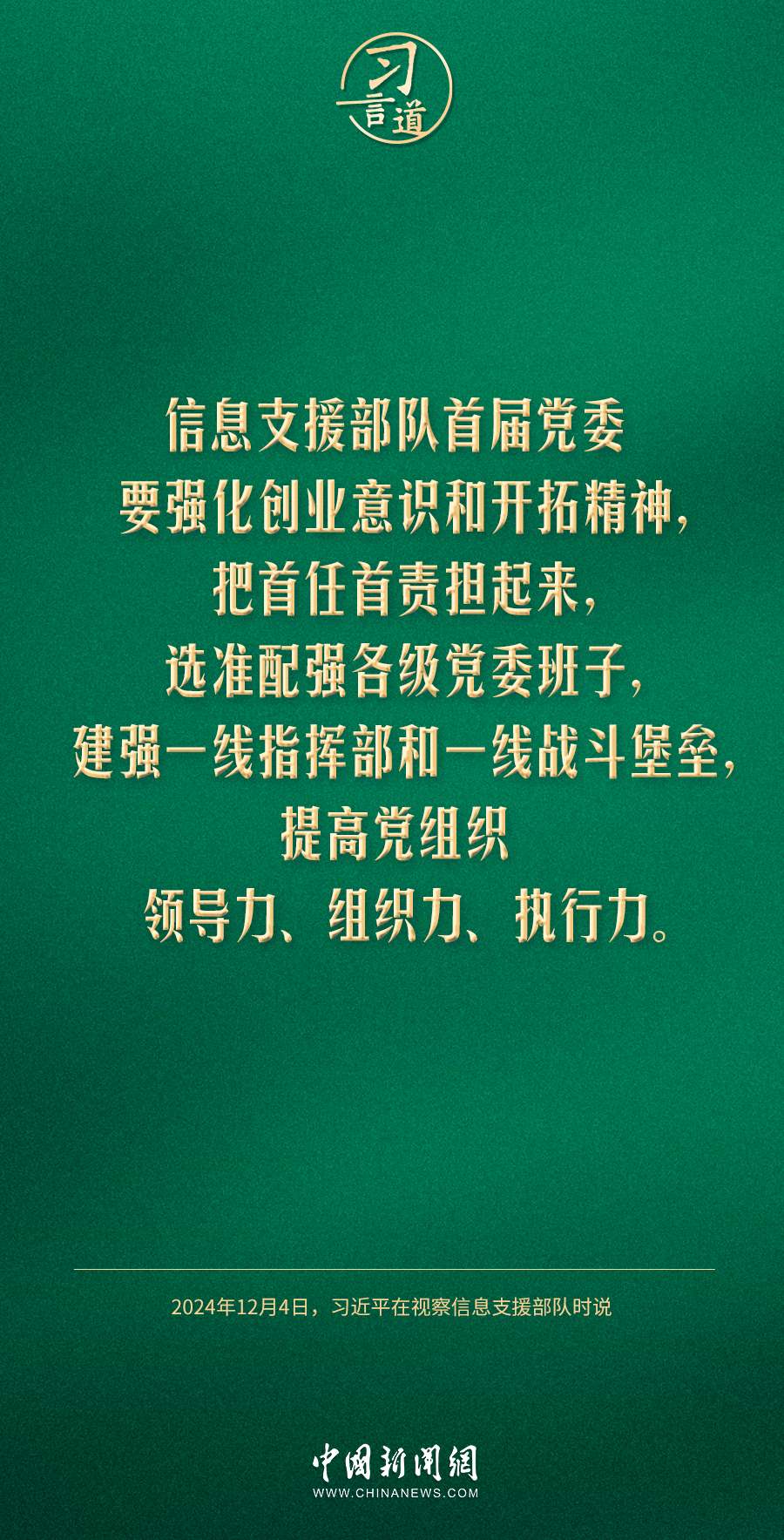 中共中央總書(shū)記、國(guó)家主席、中央軍委主席習(xí)近平4日視察信息支援部隊(duì),代表黨中央和中央軍委,對(duì)信息支援部隊(duì)第一次黨代表大會(huì)的召開(kāi)表示熱烈祝賀,向信息支援部隊(duì)全體官兵致以誠(chéng)摯問(wèn)候。習(xí)近平指出——