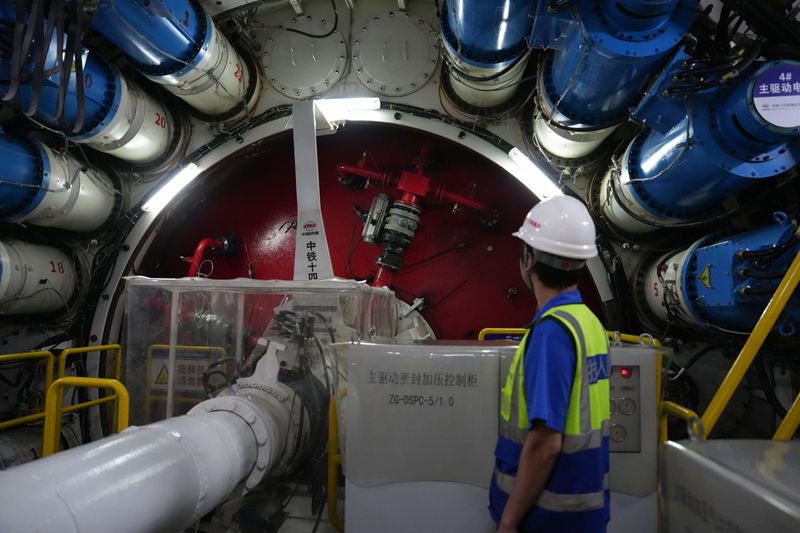 9月22日,中鐵十四局技術(shù)人員在甬舟鐵路金塘海底隧道“甬舟號”盾構(gòu)機內(nèi)關(guān)注設(shè)備運行情況。