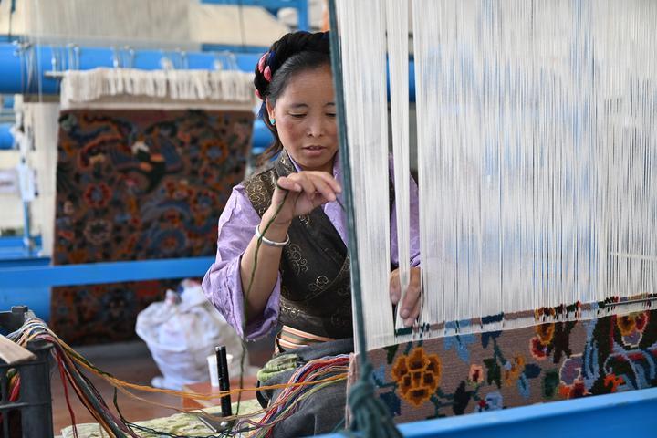 在日喀則市江孜縣的一家藏毯編織車間里,珍拉正盤腿坐在織架前,雙手在密集的經(jīng)線間靈巧地穿梭、挑動、打結,一幅寓意吉祥的大鵬金翅鳥圖案,在她手下逐漸成形。