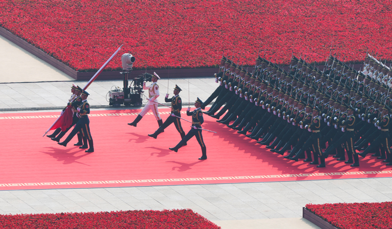 9月3日,紀(jì)念中國人民抗日戰(zhàn)爭暨世界反法西斯戰(zhàn)爭勝利80周年大會在北京隆重舉行。這是國旗護(hù)衛(wèi)隊從人民英雄紀(jì)念碑基座出發(fā),走向旗桿基座。