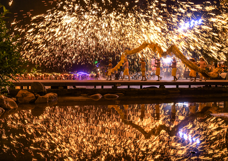 10月5日晚,在四川省成都市雙流區(qū)黃龍溪古鎮(zhèn),民間藝人為游客表演非遺“火龍燈舞”。