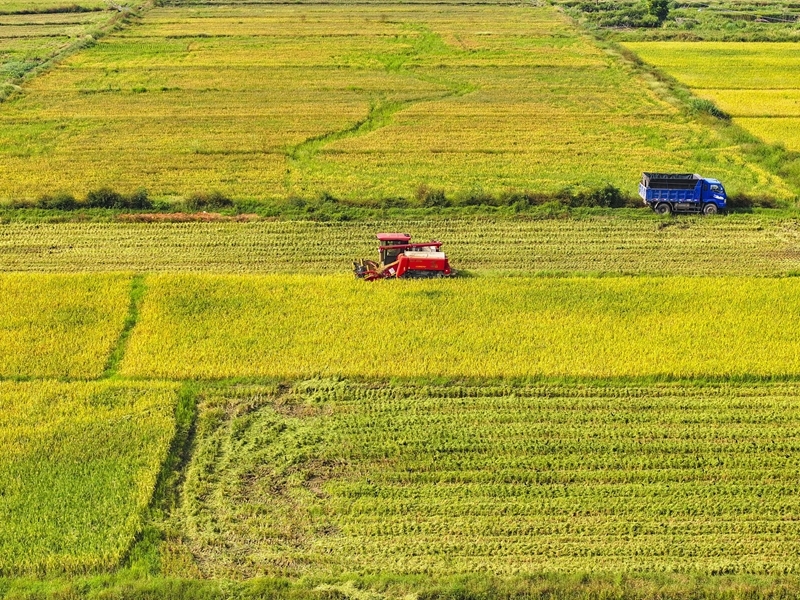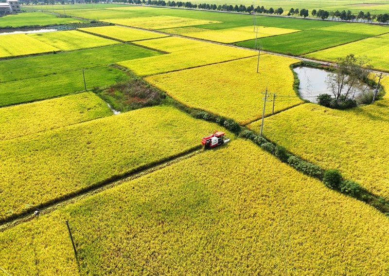 10月11日,湖南省衡陽市衡山縣白果鎮(zhèn)村民駕駛農(nóng)機(jī)收割稻谷(無人機(jī)照片)。