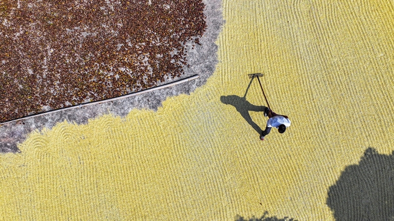 10月11日,湖南省常寧市蘭江鄉(xiāng)農(nóng)民在晾曬稻谷(無人機(jī)照片)。