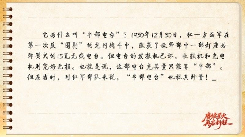 在第二次反“圍剿”的關鍵時刻,當時擔任無線電隊隊長的王諍帶領無線電隊,利用這“半部電臺”日夜不間斷地監(jiān)聽、捕捉敵人的電臺信息,最終幫助紅軍取得了第二次反“圍剿”的首戰(zhàn)勝利。