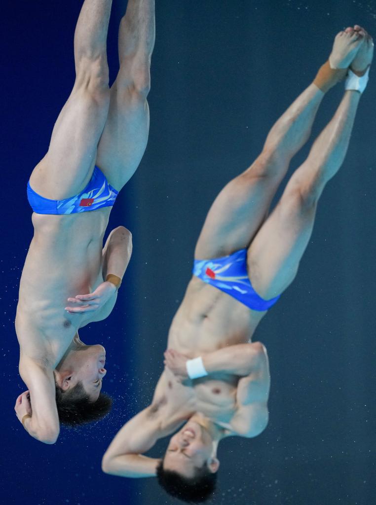 11月3日,廣東隊(duì)組合陳艾森/朱子鋒在男子雙人10米跳臺(tái)比賽中。新華社記者 薛宇舸 攝