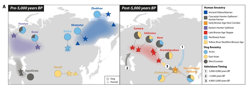 科研團隊這項研究首先發(fā)現(xiàn)中國五千年前存在獨特的家犬古老血統(tǒng),隨后數(shù)千年中國古代家犬逐漸出現(xiàn)來自西伯利亞和西方的古代家犬血統(tǒng)滲入,同時來自中國的古老東亞祖份也廣泛擴散到了歐亞草原多處。團隊通過與人類古基因組數(shù)據(jù)和證據(jù)對照,發(fā)現(xiàn)家犬?dāng)?shù)次滲入事件與人類的多次遷徙高度重合。如東西伯利亞早全新世家犬譜系與同時期人類譜系的分布高度吻合。此外,歐亞草原地區(qū)家犬中西方祖分的增加也與古人類遷移歷史相吻合,具體而言我們發(fā)現(xiàn)歐亞草原前期的新石器時代家犬和東歐狩獵采集人群相關(guān),后期的青銅時代家犬和伊朗農(nóng)耕人群和高加索狩獵采集者相關(guān)。