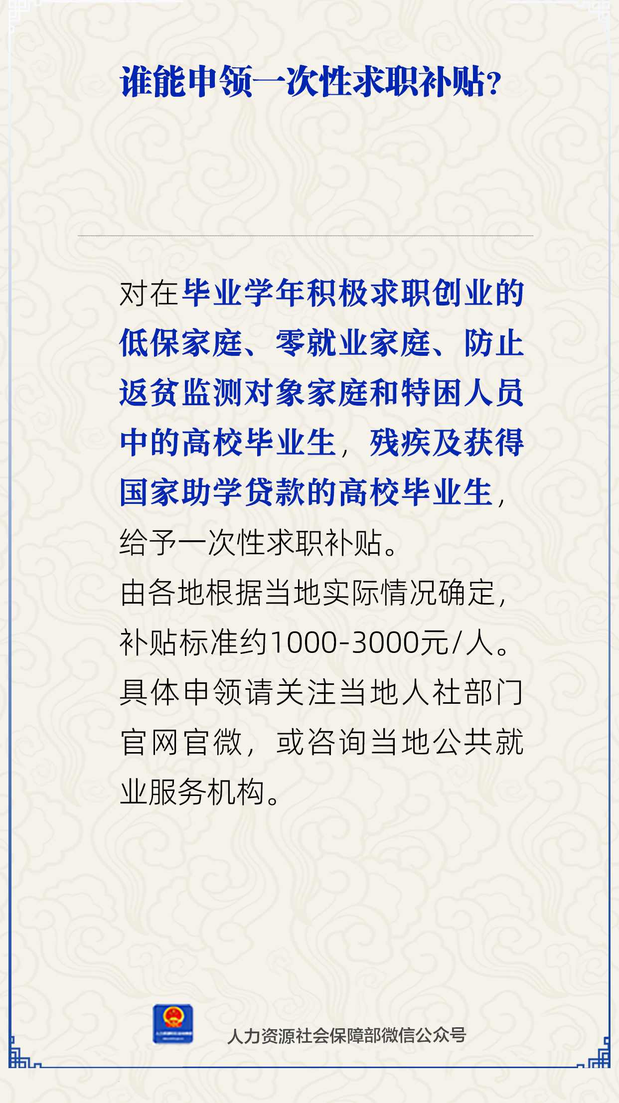 由各地根據(jù)當(dāng)?shù)貙?shí)際情況確定,補(bǔ)貼標(biāo)準(zhǔn)約1000-3000元/人。具體申領(lǐng)請(qǐng)關(guān)注當(dāng)?shù)厝松绮块T官網(wǎng)官微,或咨詢當(dāng)?shù)毓簿蜆I(yè)服務(wù)機(jī)構(gòu)。