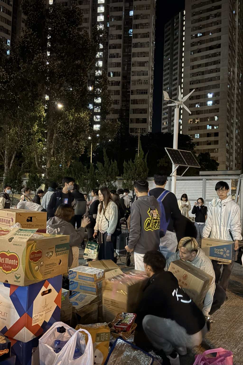 收到物資后,香港義工團隊“愛心隊”在校內(nèi)未做停歇,一名隊員介紹說,本次支援隊伍共19人,都是得知災情后從香港各區(qū)自發(fā)趕來。凌晨3點,他們和市民忙著把成堆的飲用水和食品分開摞齊,好留出通道分發(fā)物資。其間,一些人前往廣福商場為露宿居民發(fā)放被褥、暖貼和水。