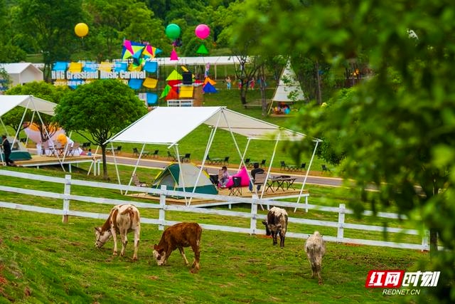 在景區(qū)內(nèi)看到,幾頭黃牛在圍欄內(nèi)悠閑踱步,遠(yuǎn)處白色帳篷點(diǎn)綴草地,彩色氣球懸空,標(biāo)識(shí)牌上寫(xiě)著“草原音樂(lè)狂歡節(jié)”。這一幕,成為景區(qū)從“田園牧歌”走向“時(shí)尚秀場(chǎng)”的縮影。