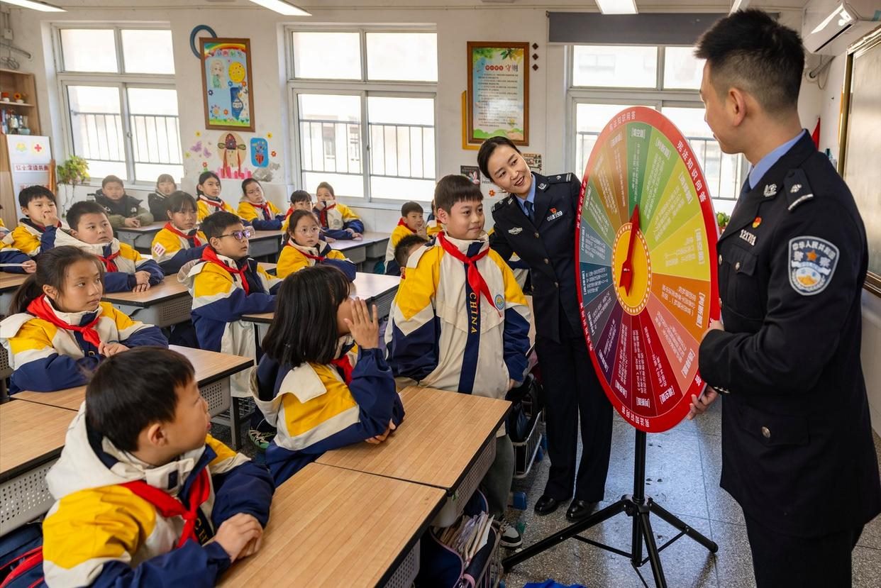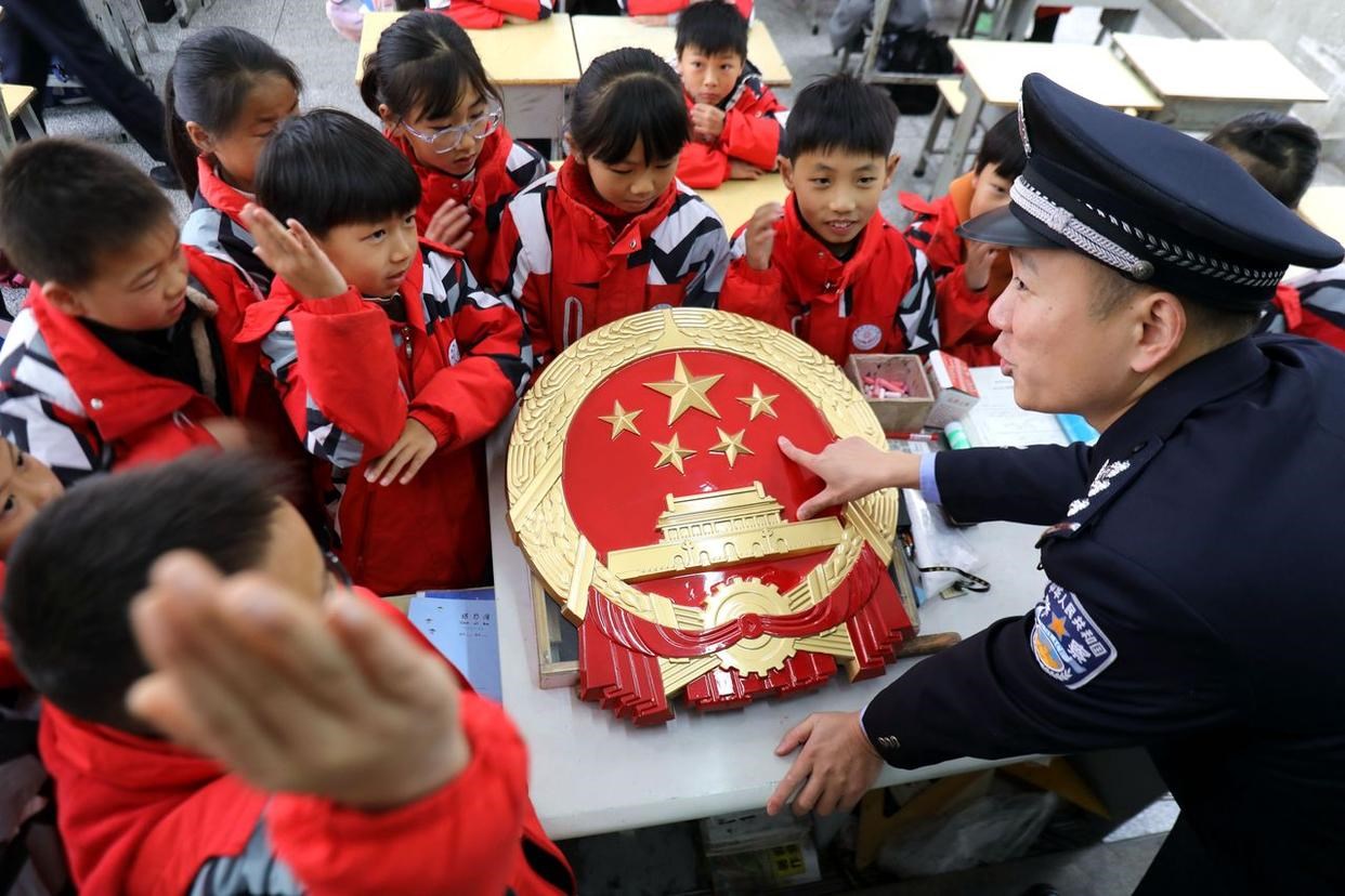 12月4日,民警在江蘇省泰州市海陵區(qū)九龍實驗學(xué)校給學(xué)生講解憲法知識。當(dāng)?shù)?,通過咨詢、普法課堂等多種形式開展憲法宣傳教育活動,弘揚憲法精神,提升公民法治素養(yǎng)。(工人日報通訊員 湯德宏 攝)