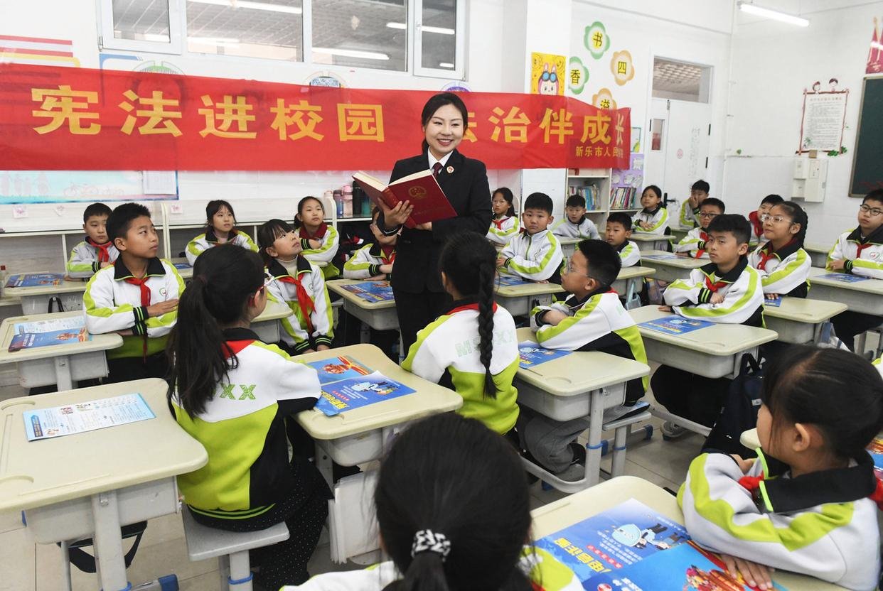 12月3日,在河北省石家莊新樂市民生街小學(xué),新樂市人民檢察院工作人員給學(xué)生講解憲法知識。(工人日報通訊員 賈敏杰 攝)
