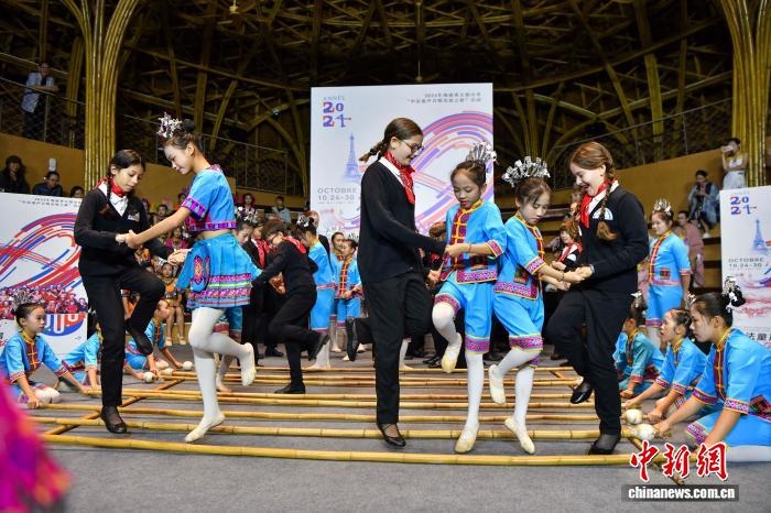 2024年10月27日,海南省五指山市,法國巴黎寶麗聲童聲合唱團(tuán)與海南五指山黎苗童聲合唱團(tuán)成員一起體驗(yàn)竹竿舞。中新社記者 駱云飛 攝