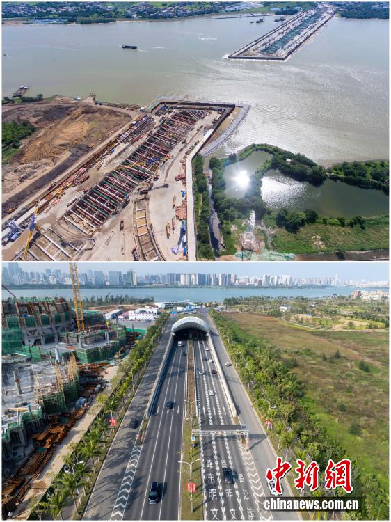2025年12月18日,海南自由貿(mào)易港正式啟動(dòng)全島封關(guān)。近年來,海南自貿(mào)港建設(shè)在利好政策帶動(dòng)下不斷刷新“自貿(mào)港速度”,一個(gè)個(gè)重大項(xiàng)目、重點(diǎn)園區(qū)拔地而起,直觀呈現(xiàn)海南自貿(mào)港的蓬勃生機(jī)。這里正成為中國對(duì)外開放的新前沿、互利合作的新熱土和推動(dòng)經(jīng)濟(jì)全球化的新引擎。上資料圖為2019年6月19日的??谖拿鳀|越江隧道施工現(xiàn)場,下資料圖為2025年12月7日已建成通車的海南省首條跨越南渡江隧道——文明東隧道。(拼版圖,無人機(jī)照片)