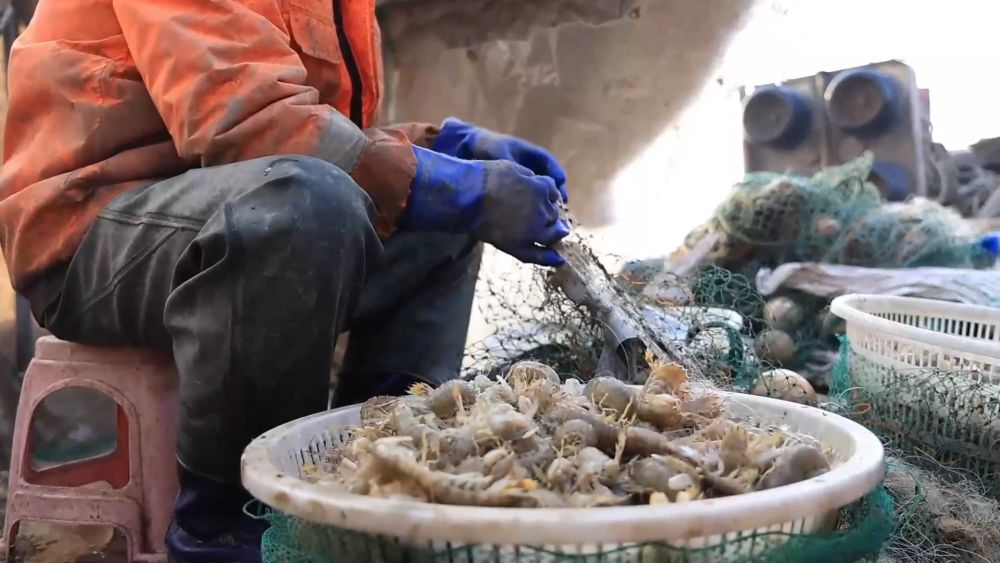 在無棣縣埕口鎮(zhèn),漁民清晨便駕船出海。隨著漁網收起,一只只活蹦亂跳的琵琶蝦躍上甲板。漁民隨即進行分揀、清洗和裝筐。