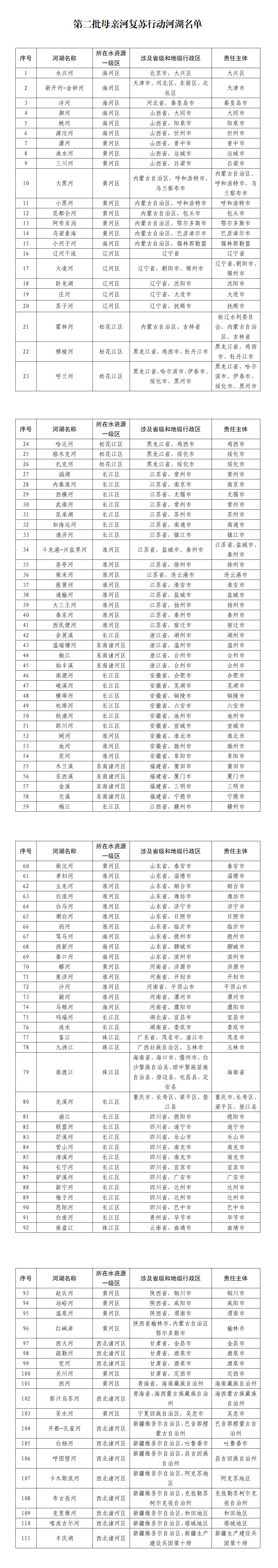 2022年以來(lái),水利部圍繞解決河道斷流、湖泊萎縮干涸問(wèn)題,在全國(guó)率先選取了88條(個(gè))河(湖)開(kāi)展母親河復(fù)蘇行動(dòng)。為進(jìn)一步擴(kuò)大母親河復(fù)蘇行動(dòng)范圍,水利部聚焦河道斷流、湖泊萎縮、水動(dòng)力不足等問(wèn)題,全面分析河湖水資源、水生態(tài)狀況,將復(fù)蘇需求迫切、具有復(fù)蘇可行性的111條(個(gè))河(湖)納入第二批母親河復(fù)蘇行動(dòng),涉及29個(gè)省份和新疆生產(chǎn)建設(shè)兵團(tuán)。