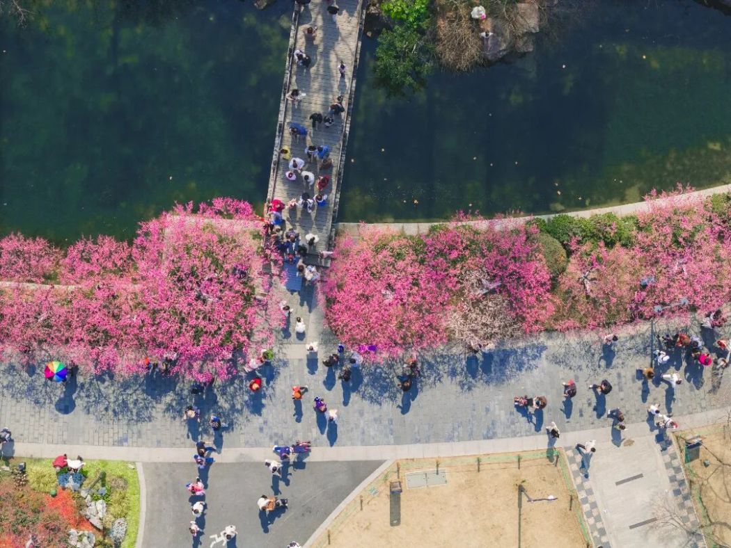 與常州遙相呼應(yīng),江城武漢的東湖梅園里,三萬余株梅花傲雪凌霜。梅香幽幽、沁人心脾,身著漢服的游客梅下留影,闔家出游的市民漫步賞梅,盡享團(tuán)圓溫馨時(shí)光。紅燈籠點(diǎn)綴在紅白梅枝間,歡聲笑語漫過整個(gè)園區(qū),將江城的年味渲染得熱氣騰騰。