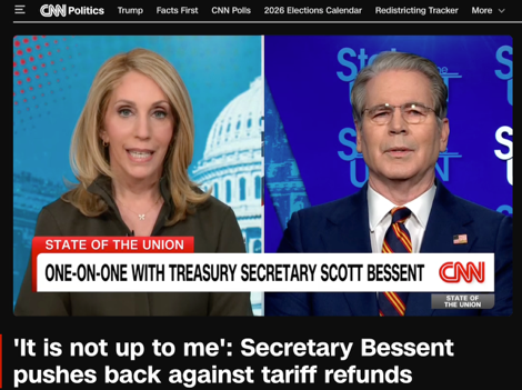 當?shù)貢r間2月22日,美國財政部長斯科特·貝森特在接受美國有線電視新聞網(CNN)采訪時,被主持人達娜·巴什追問著一個看似直接、卻難以直接回答的問題:既然最高法院已裁定特朗普政府依據《國際緊急經濟權力法》(IEEPA)征收的大范圍“緊急關稅”缺乏授權,那么此前收上來的巨額關稅款,退不退、怎么退?