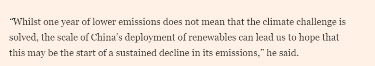 同時(shí),文章稱南安普頓大學(xué)的一位氣候科學(xué)家表示,這些數(shù)據(jù)令人鼓舞,因?yàn)樗鼈儽砻髦袊?guó)對(duì)綠色能源的大規(guī)模投資開始轉(zhuǎn)化為可衡量的成果。“雖然一年的減排并不意味著氣候挑戰(zhàn)已經(jīng)解決,但中國(guó)在可再生能源方面的大規(guī)模發(fā)展讓我們有理由期待,這或許將是其排放量持續(xù)下降的開端?!?/p>
