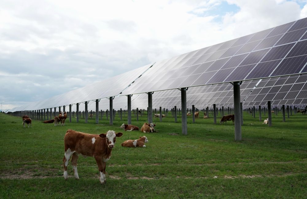 牛群在河北省圍場滿族蒙古族自治縣御道口鎮(zhèn)附近的一處“牧光互補”光伏發(fā)電場吃草(2024年7月25日攝)。新華社記者 楊世堯 攝
