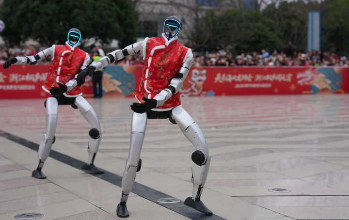 2026年2月28日,宇樹科技人形機(jī)器人在浙江省桐廬縣中心廣場表演舞蹈。新華社記者黃宗治 攝