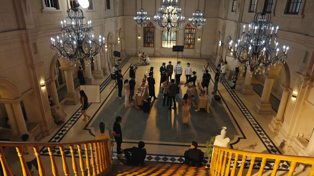 2025年7月,河南省鄭州市金水區(qū)一微短劇拍攝基地,某微短劇正在搭建的“宴會(huì)廳”場(chǎng)景中拍攝。新華社記者楊金鑫 攝