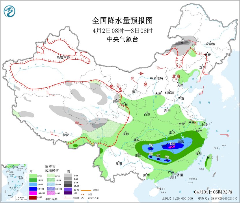 4月2日08時至3日08時,內蒙古東部、西藏東部、青海南部、甘肅河西、川西高原北部等地部分地區(qū)有小到中雪或雨夾雪,其中,內蒙古東部等地部分地區(qū)有大雪(5~9毫米)。江南大部、華南北部、貴州中東部等地部分地區(qū)有中到大雨,其中,貴州東部、湖南中部、江西中部、廣東北部、廣西東北部等地部分地區(qū)有暴雨或大暴雨(100~130毫米)。內蒙古大部、遼東半島、山東半島、江蘇南部、西藏、甘肅河西等地部分地區(qū)有4~6級風,西藏東部部分地區(qū)有6~7級風;渤海、東海南部海域、臺灣海峽、巴士海峽、北部灣將有5~6級風、陣風7級。